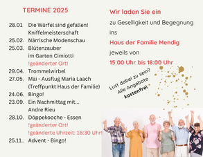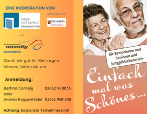 Mit diesem Motto lockt die Verbandsgemeinde Mendig in Kooperation mit der Katholischen Familienbildungsstätte Mayen e.V. ältere Junggebliebene 60 plus ins Haus der Familie. Einmal im Monat dienstags wird hier etwas geboten, was die Teilnehmenden aufblühen lässt: Geplant sind zum Beispiel Bingo- Nachmittage, Tanz-Tees, Hobbytheken und vieles mehr. Den aktuellen Termin und das "Schöne" des Nachmittags entnehmen Sie unserem Flyer. Die Teilnahme ist immer kostenfrei. Es wird jedoch um Anmeldung gebeten, damit gut für Sie gesorgt werden kann: bei Bettina Cornely, VG Mendig 02652 980035 oder Andrea Roggenfelder, Haus der Familie Mendig 02652 9581558. Herzliche Einladung!